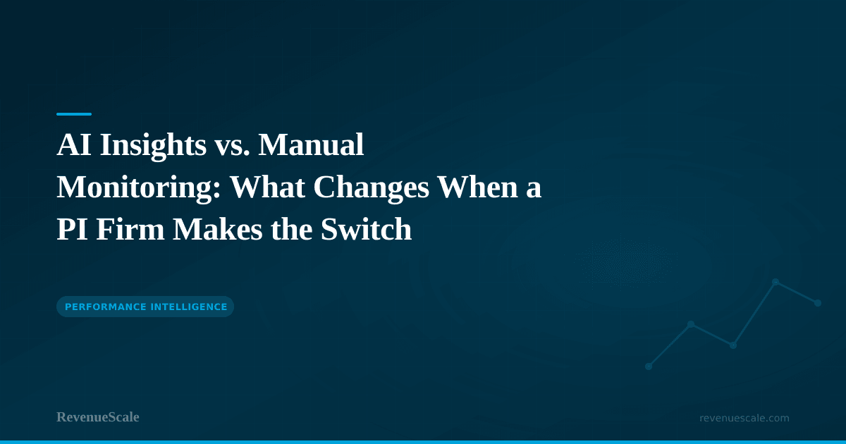 Every PI marketing director knows the weekly routine: pull data from five or six vendor portals, cross-reference against the CRM, build a spreadsheet, scan for problems, format a report, and send it to leadership. That process consumes 8 to 12 hours per week — and it still misses things. AI-powered performance intelligence replaces that entire workflow with something fundamentally different.